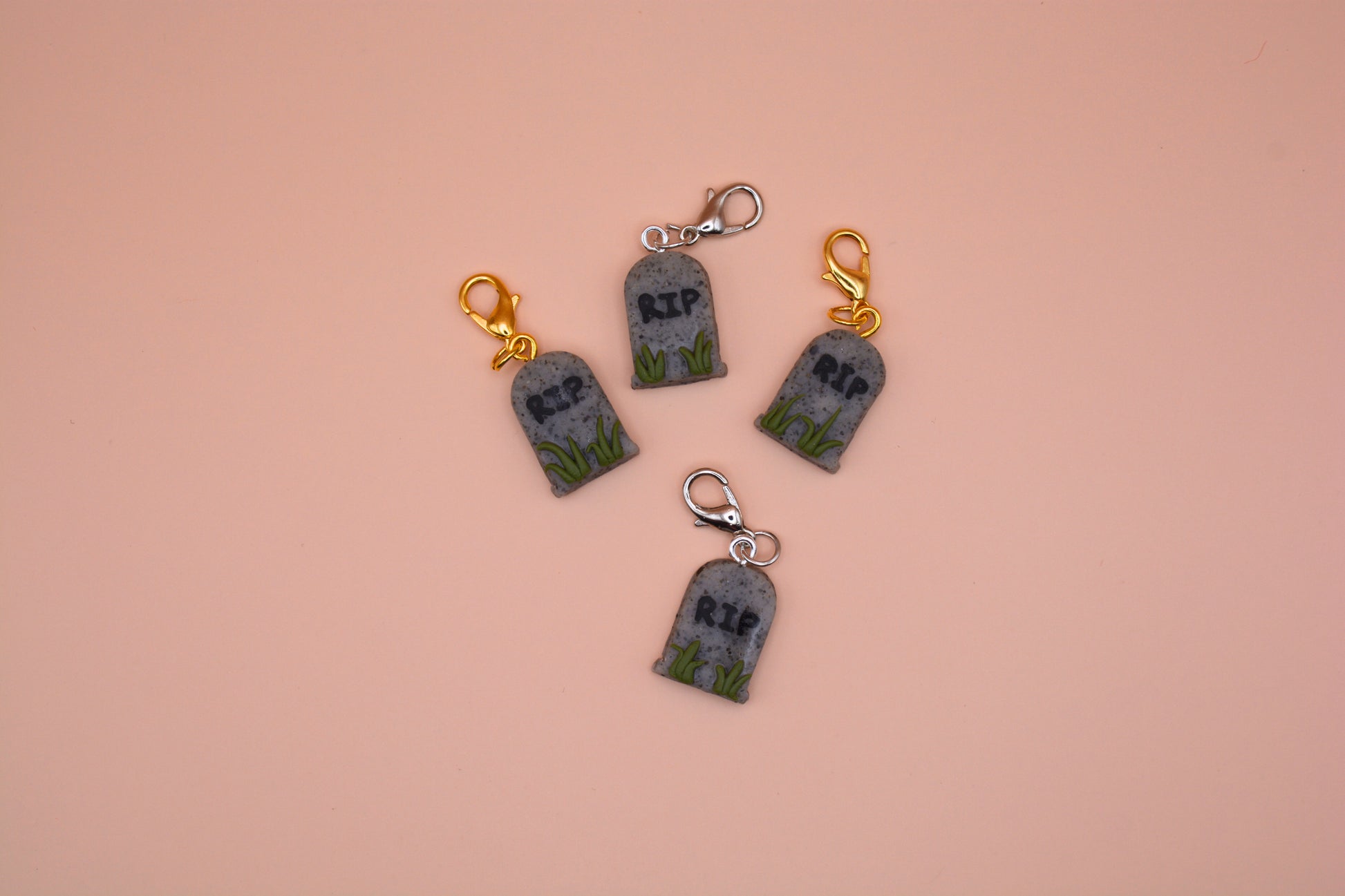 These cute little guys are drop dead adorable for any bag charm collection! Each little tombstone is handmade out of polymer clay, coated with a matte polyurethane finish, and complete with a lobster clasp of either silver or gold!